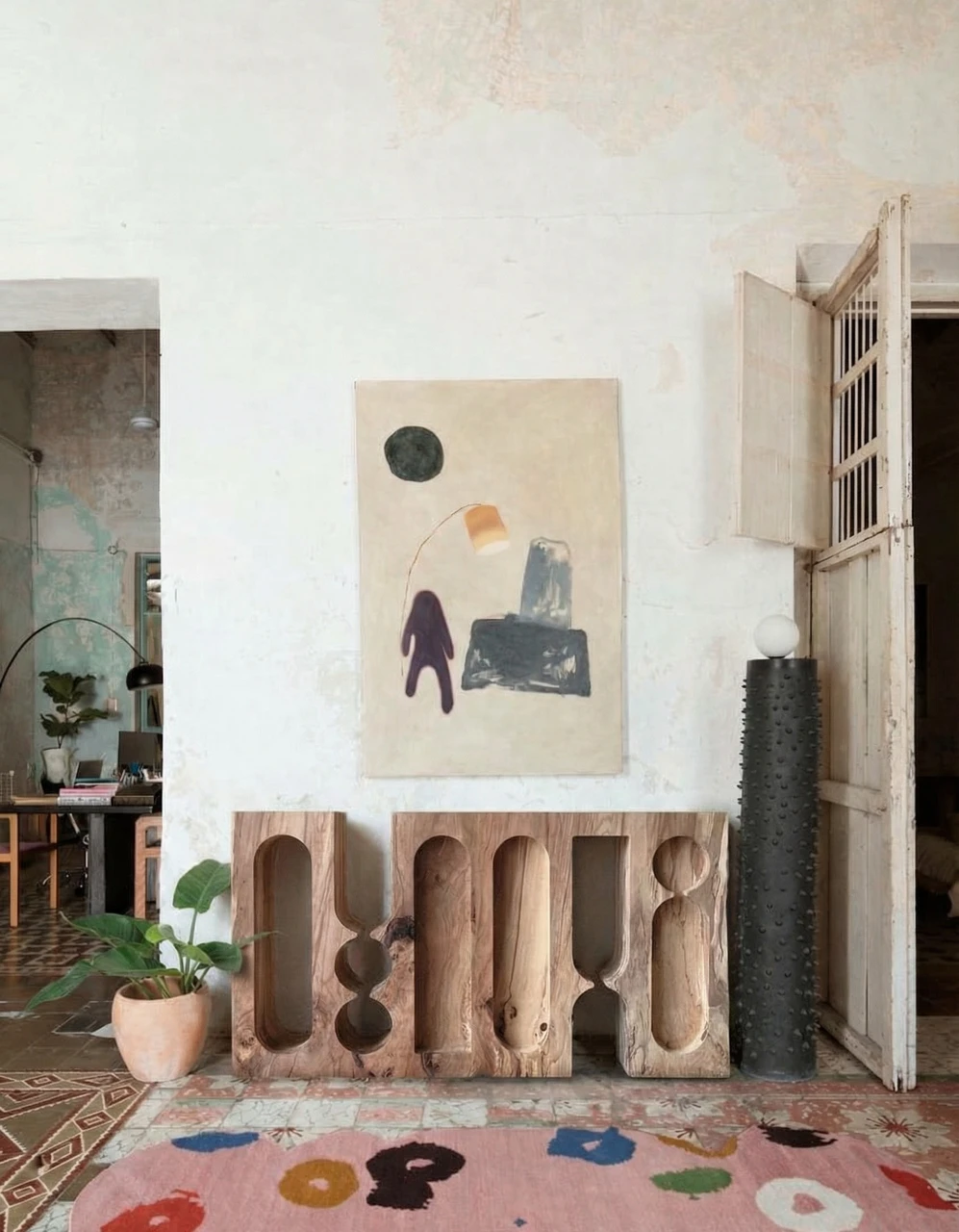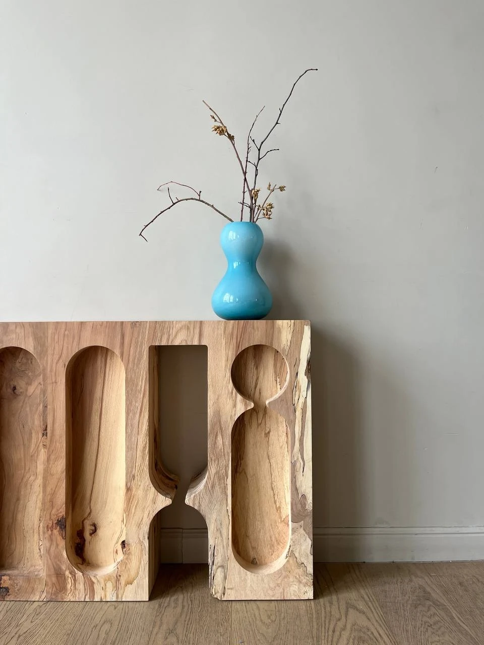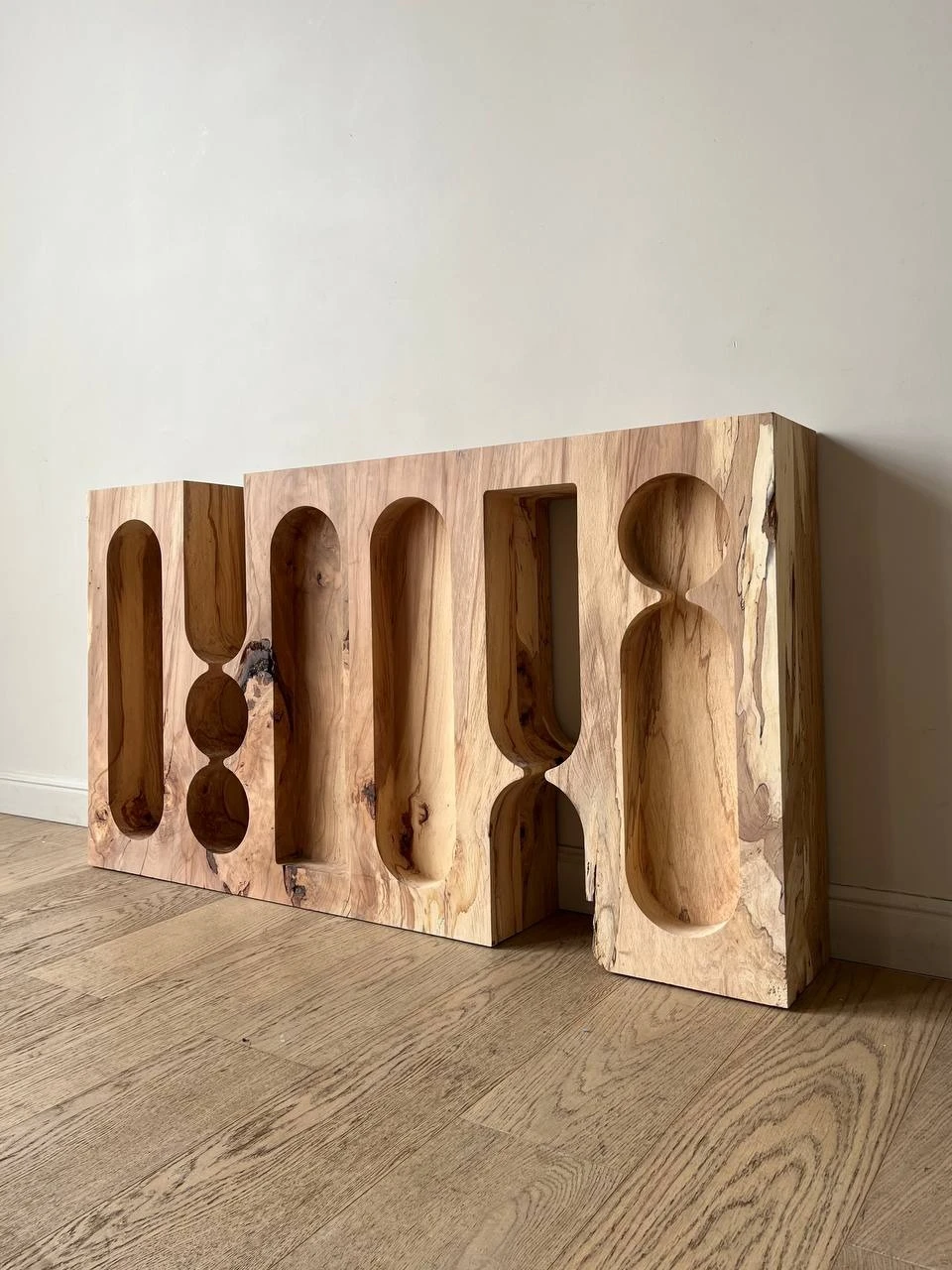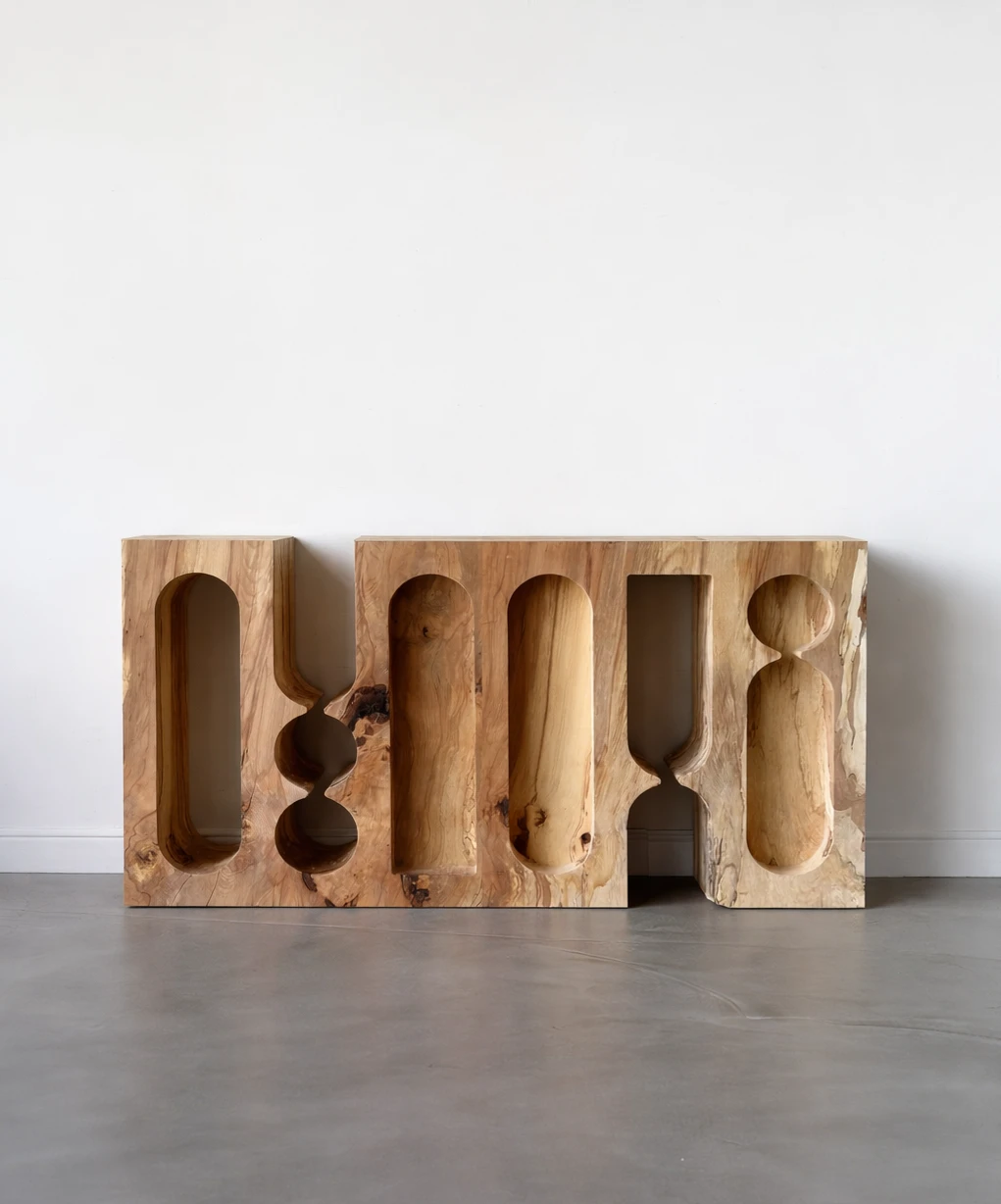 Органический рисунок древесины вступает в диалог с плавной пластикой вырезов, подчёркивая глубину материала и его монолитность. Предмет воспринимается как фрагмент архитектурной структуры, в котором функциональность скрыта внутри скульптурной оболочки. Тумба существует как цельный объём, где пустота работает наравне с массивом, создавая ощущение спокойной, почти медитативной формы.