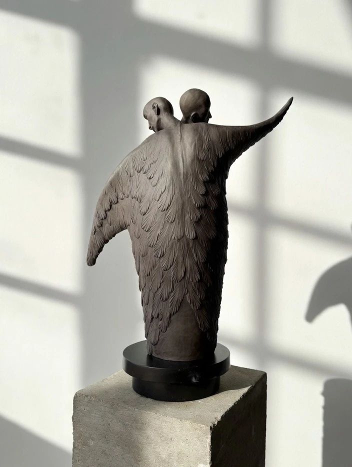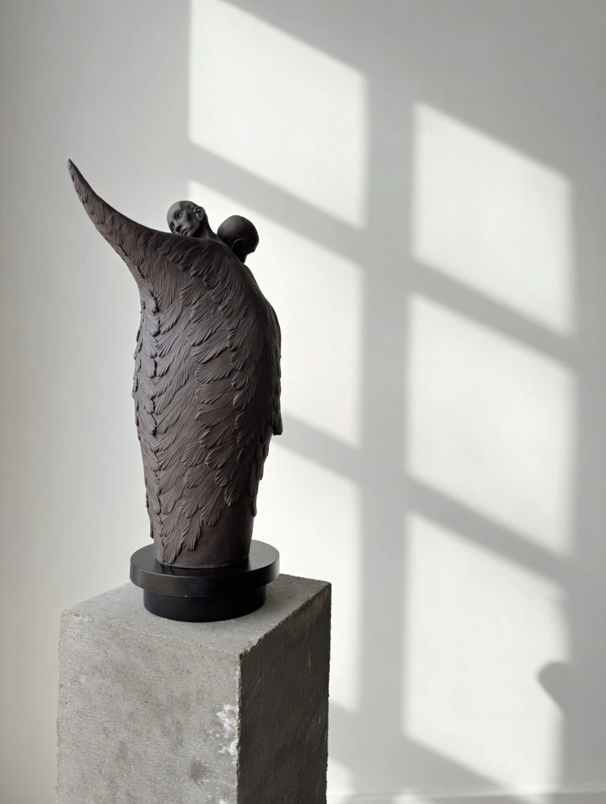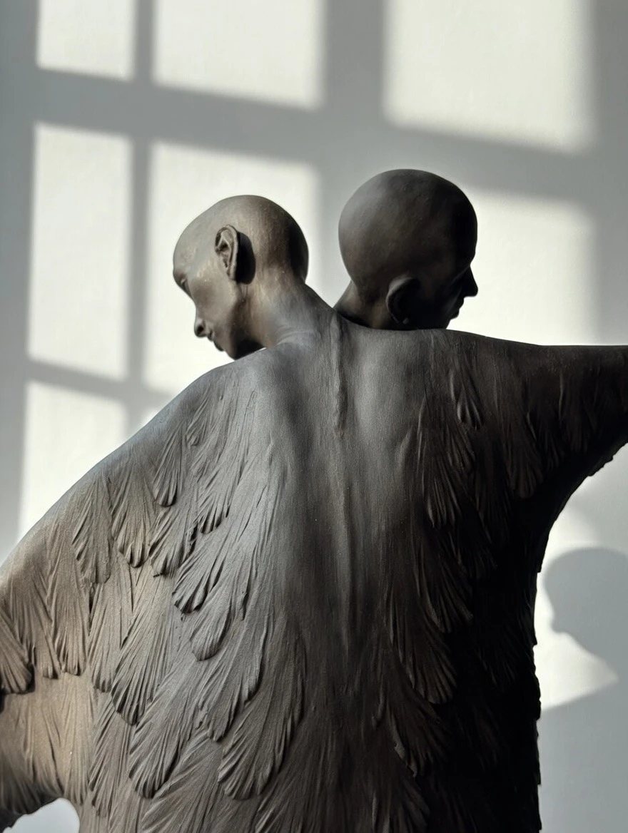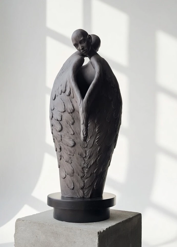В серии я продолжаю исследование сосуда как образа человеческого присутствия, вместилища памяти, опыта, уязвимости и света. Форма приобретает очертания ангельской фигуры, понимаемой как состояние души. Эти ангелы стоят рядом с человеком. Их сложенные крылья одновременно защита и тяжесть. Замкнутая форма хранит тишину, свет и несказанные слова. Сосуд воспринимается как тело и как внутреннее пространство, которое может быть наполнено водой и цветами, продолжая жест заботы и присутствия.