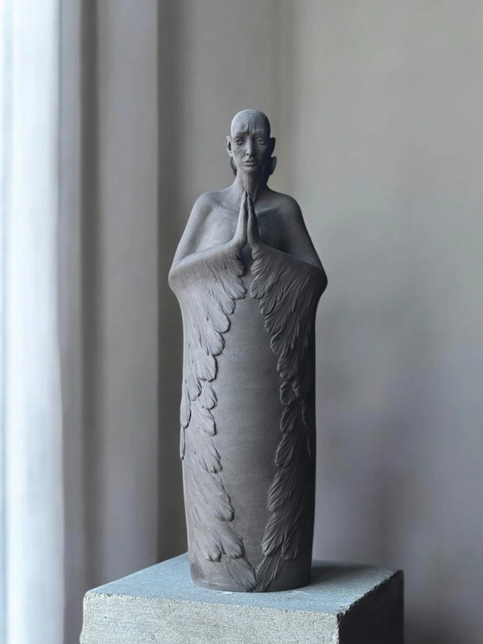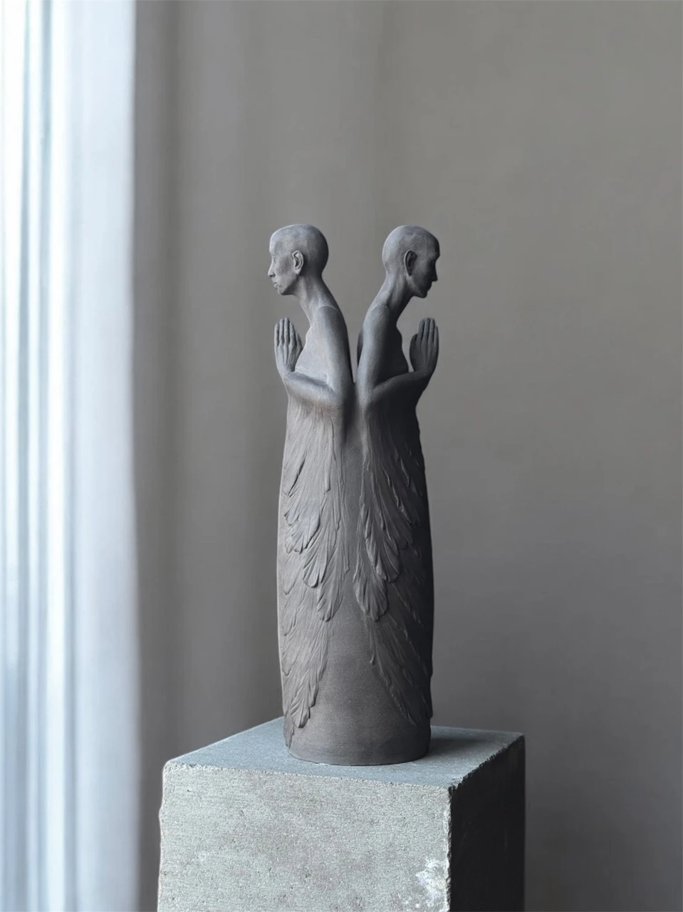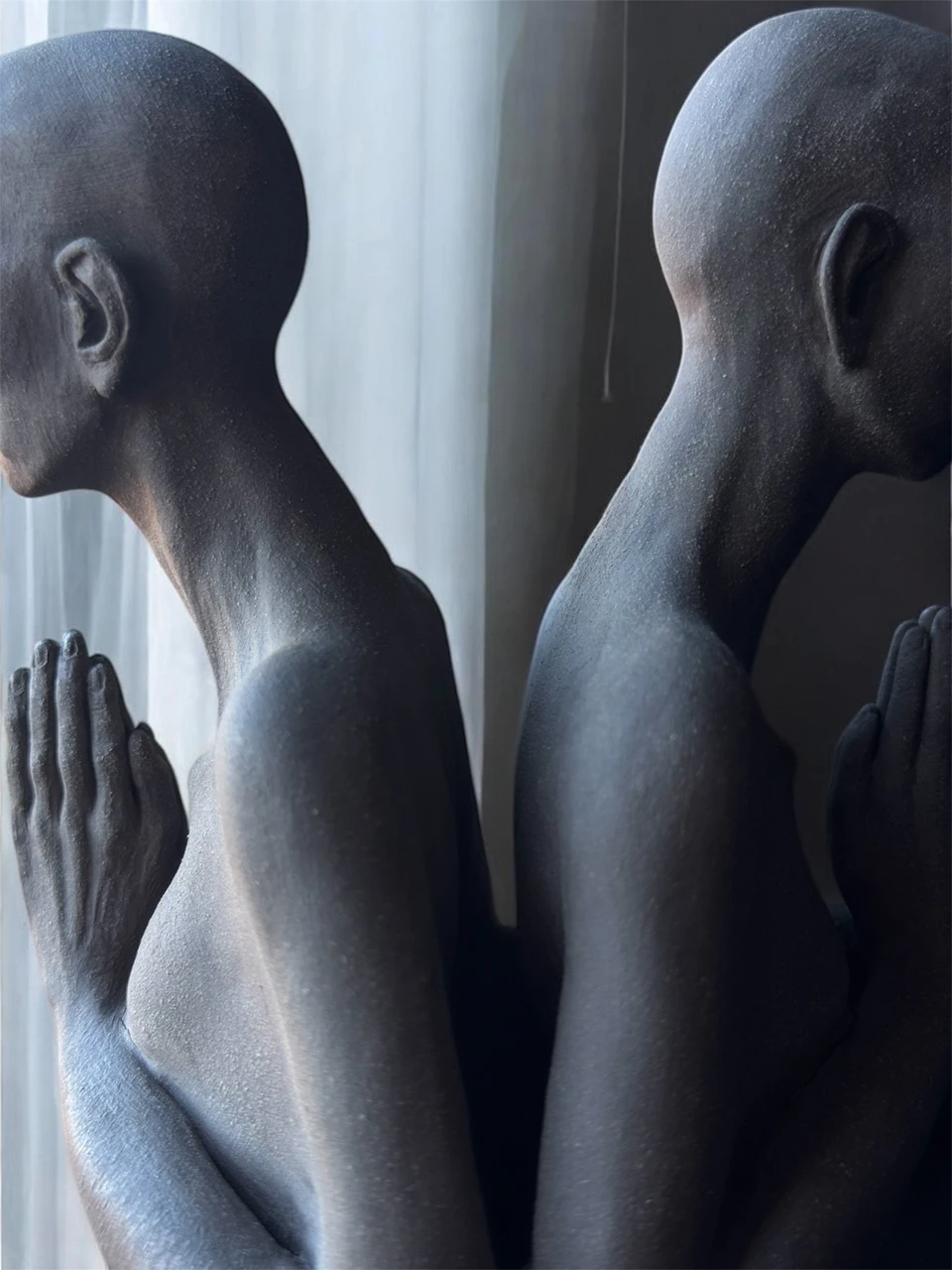 Каждая из них погружена в собственную бездонность, как в воду, где отсутствуют дно и отражения. Их руки соединены впереди, ладонь к ладони, жест, в котором нет удержания, только точка совместного молчания. Крылья, прорастающие из рук, не расправлены, они замыкают форму, собирая её внутрь.