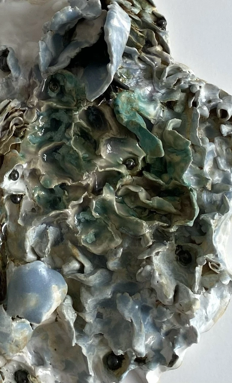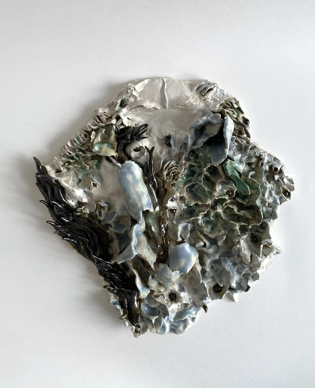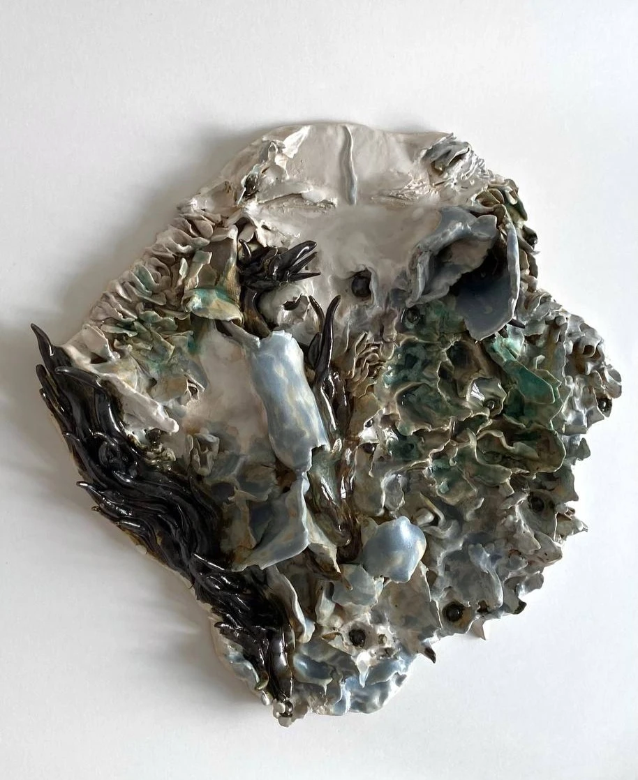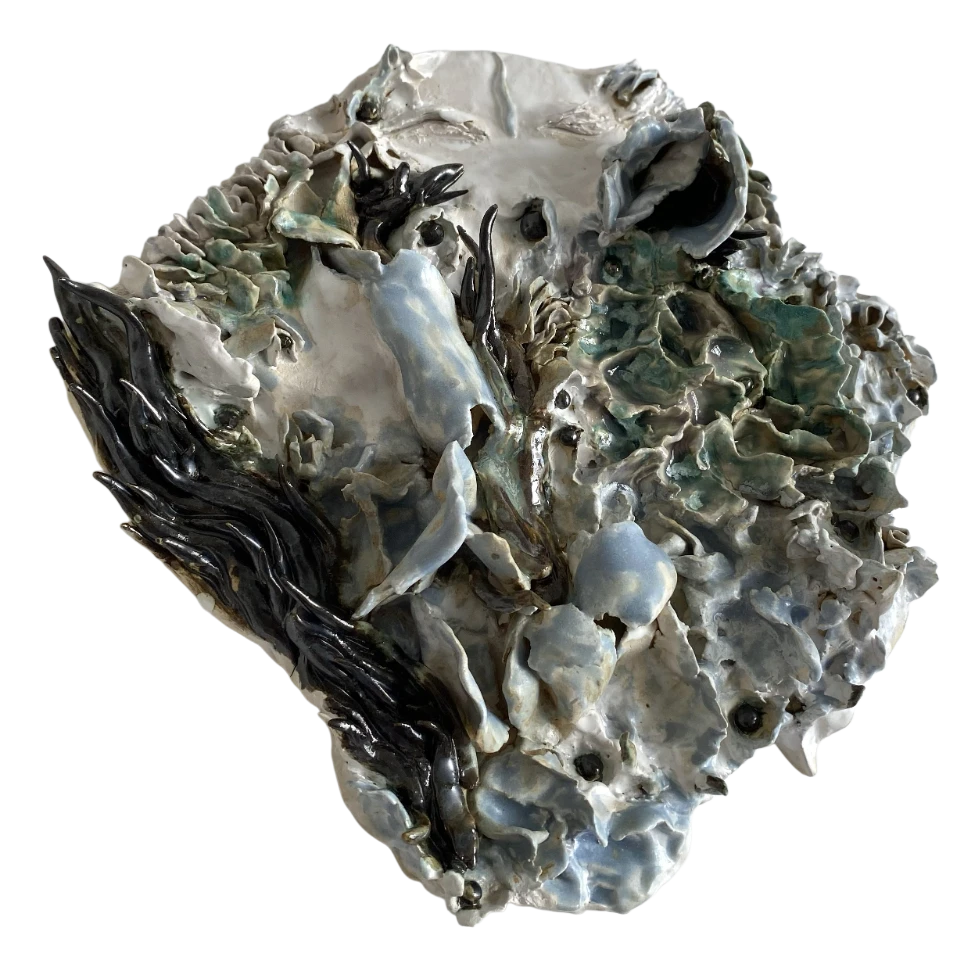 Керамическое панно выполнено в технике ручной лепки в единственном экземпляре с использованием глазурей собственного изготовления и вкраплений из стекла.