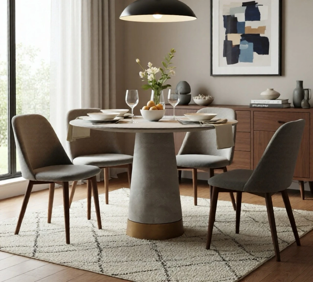 Обеденный круглый стол «Тимьян» (110 см) на одной конусной ноге порадует вас своим минималистичным дизайном с декоративным элементом бетона. Легкий и устойчивый, идеально впишется в любой интерьер.