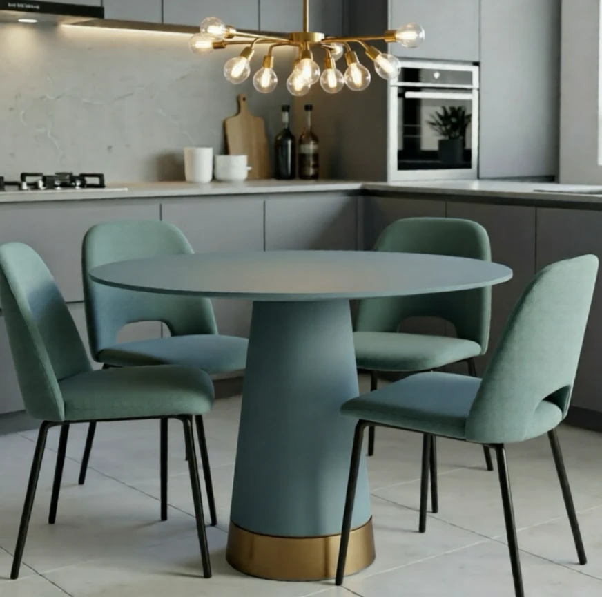 Обеденный круглый стол «Тимьян» (110 см) на одной конусной ноге порадует вас своим минималистичным дизайном с декоративным элементом бетона. Легкий и устойчивый, идеально впишется в любой интерьер.