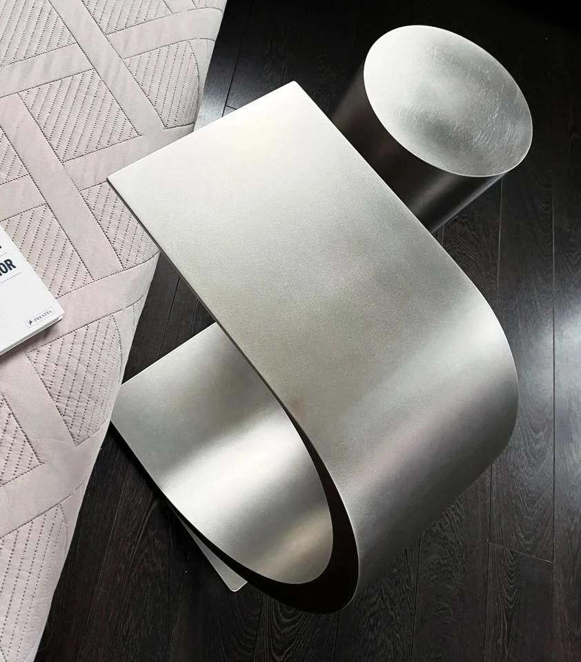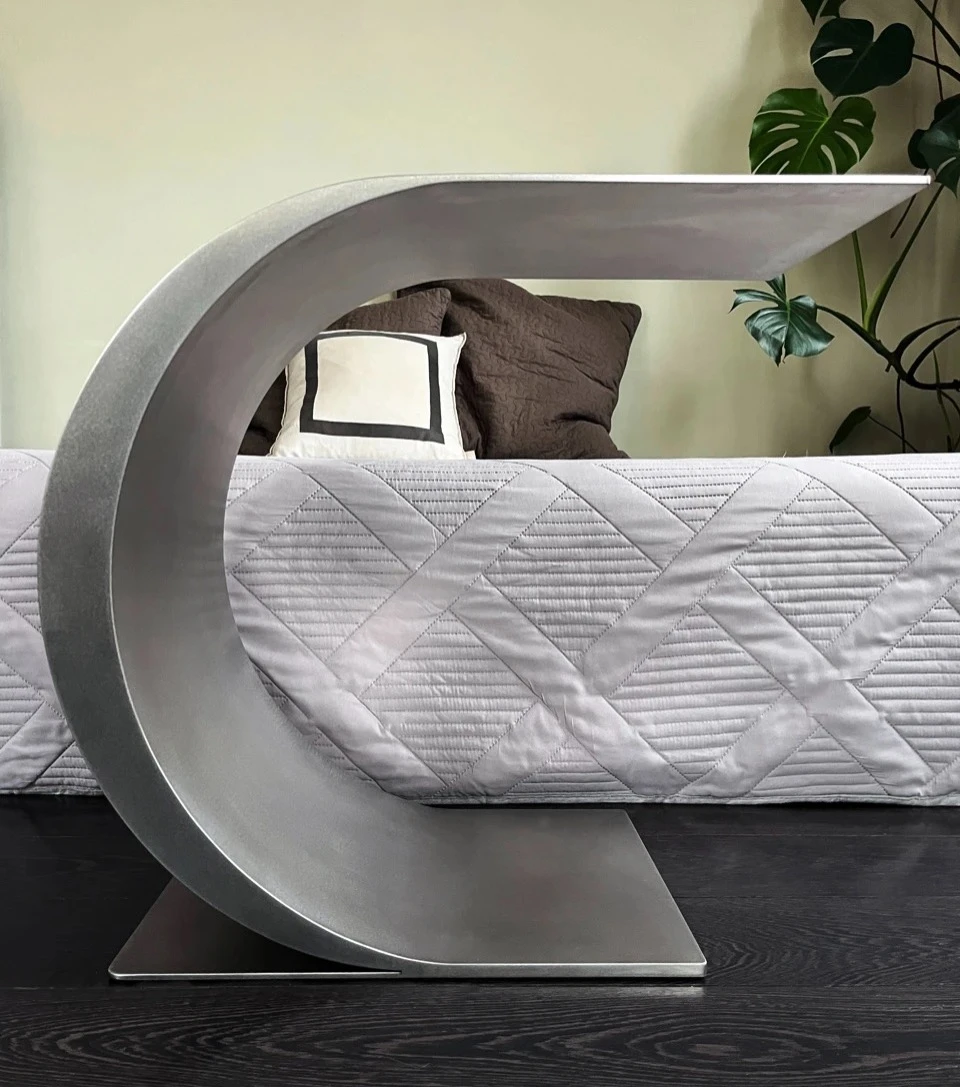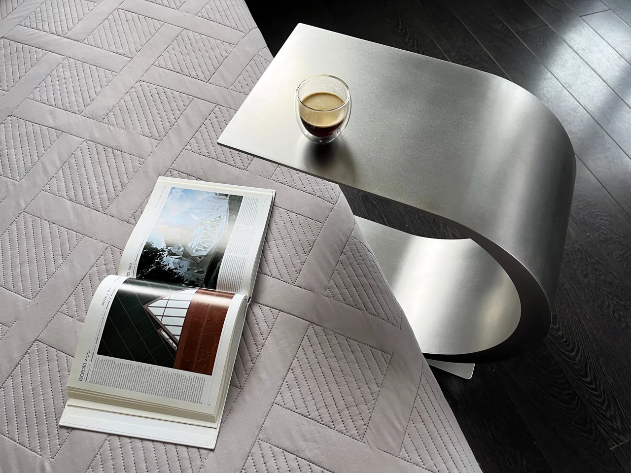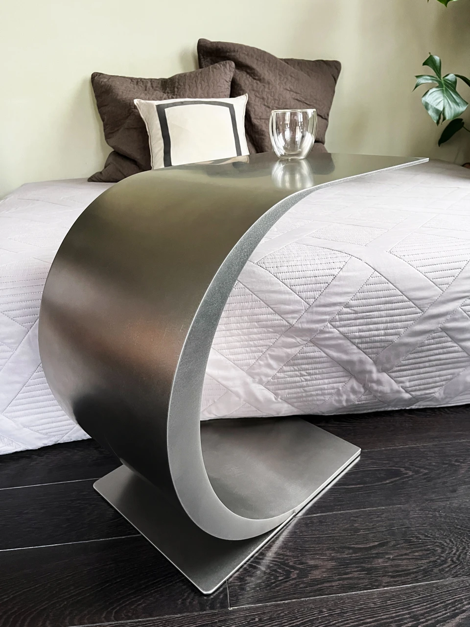 Столик Месяц — изящная форма и основательное исполнение. Полностью выполнен из сатинированной нержавеющей стали, придающей ему неброское свечение и блеск. Прекрасно подойдет для того, чтобы устроиться рядом в кресле с чашкой кофе.