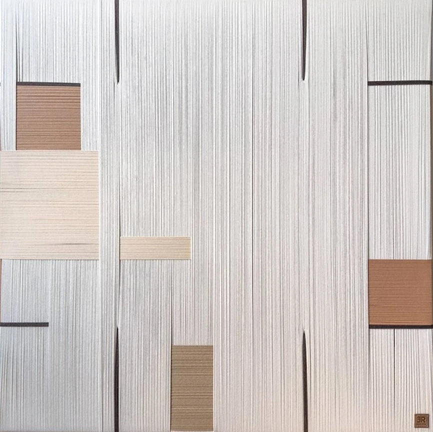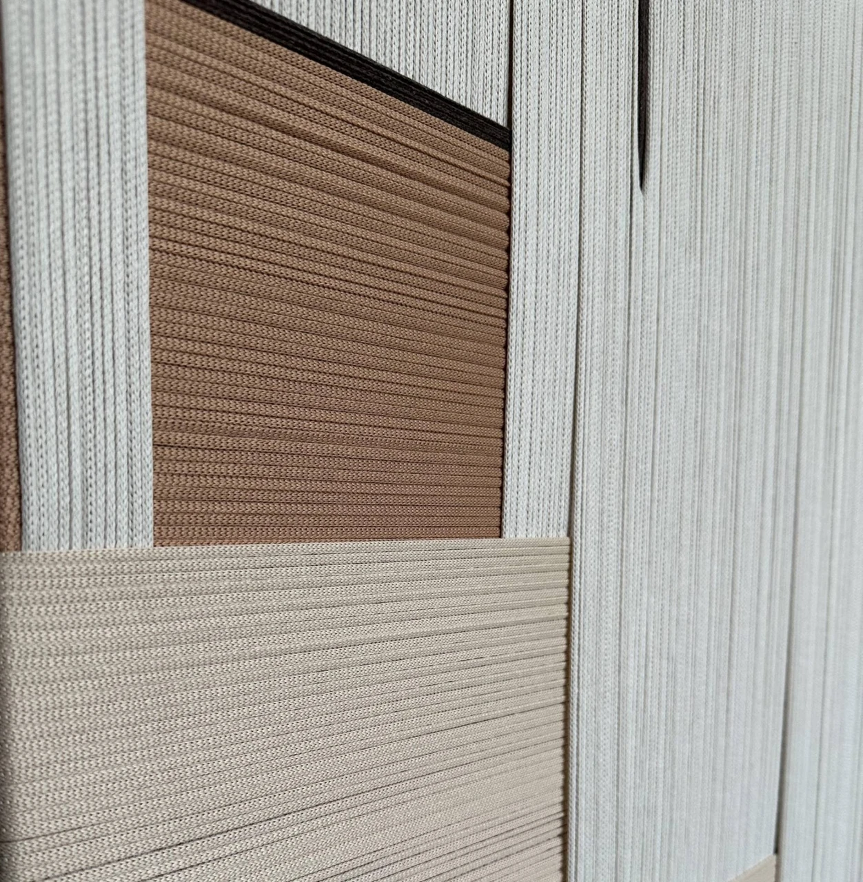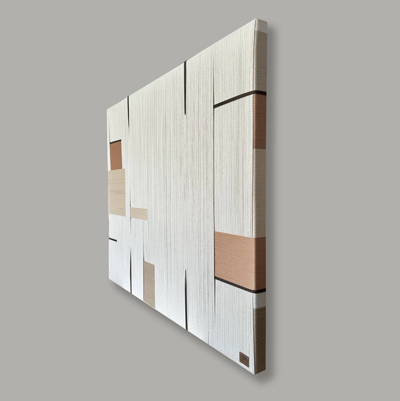 Панно текстильное «Туман» выполнено в минималистичном стиле, где главная роль отведена фактуре и ритму. Вертикальные тонкие линии, словно мягкая завеса, напоминают утренний туман, медленно рассеивающийся в пространстве. На этом спокойном фоне расположены геометричные вставки природных оттенков — от тёплого бежевого до насыщенного терракотового.