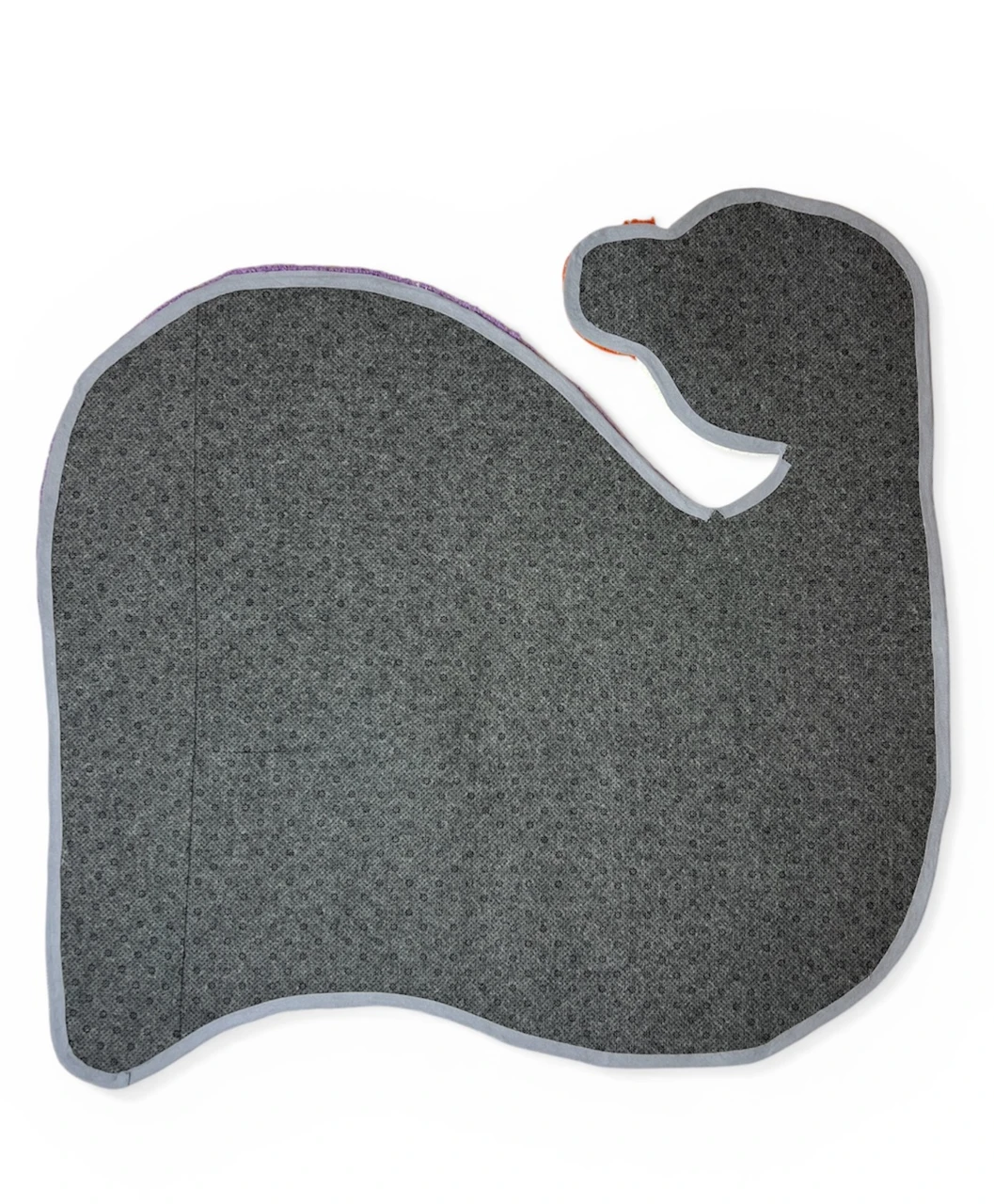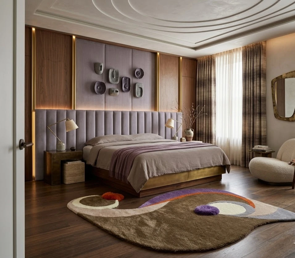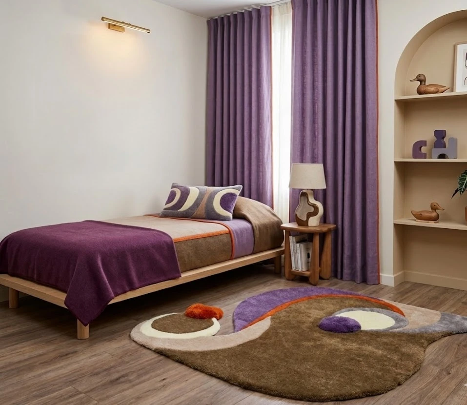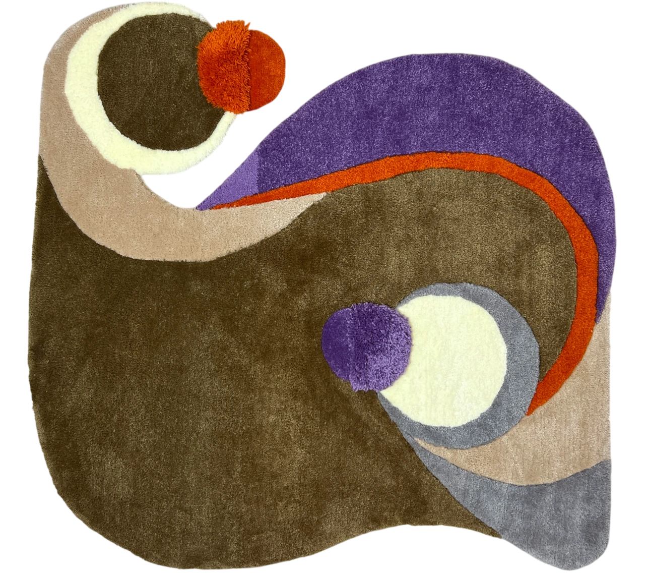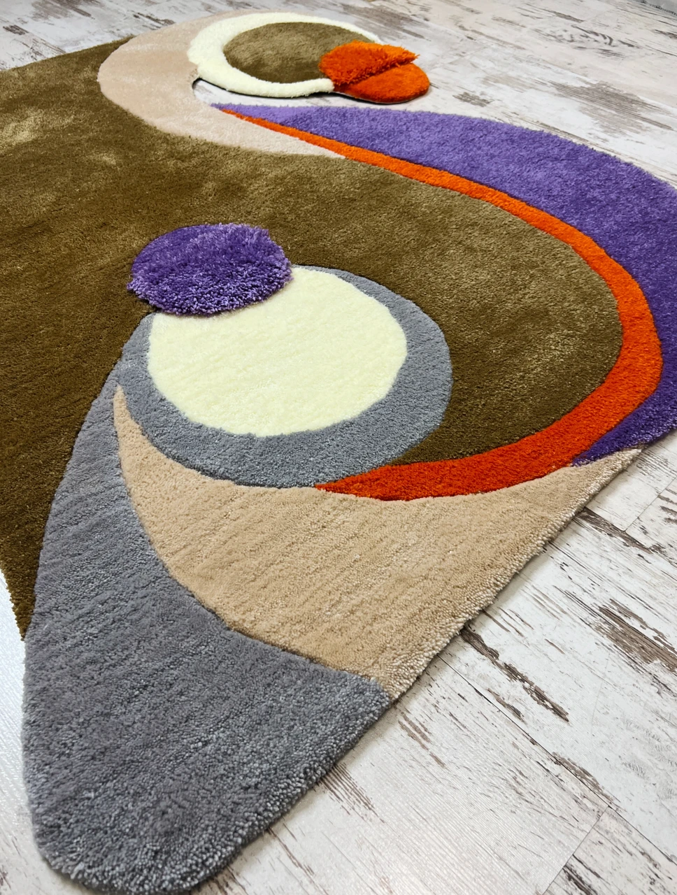 Химия между людьми возникает в момент, когда находятся точки соприкосновения. Энергия, пульсирующая в этот момент, переливается вдохновляющими цветами и озаряет все вокруг. Этот момент передан в сюжете ковра изгибающимися плавными линиями и выбором оранжевого и фиолетового цветов. Для бОльшей выразительности между полосами выполнен контуринг (художественное выстригание ворса).