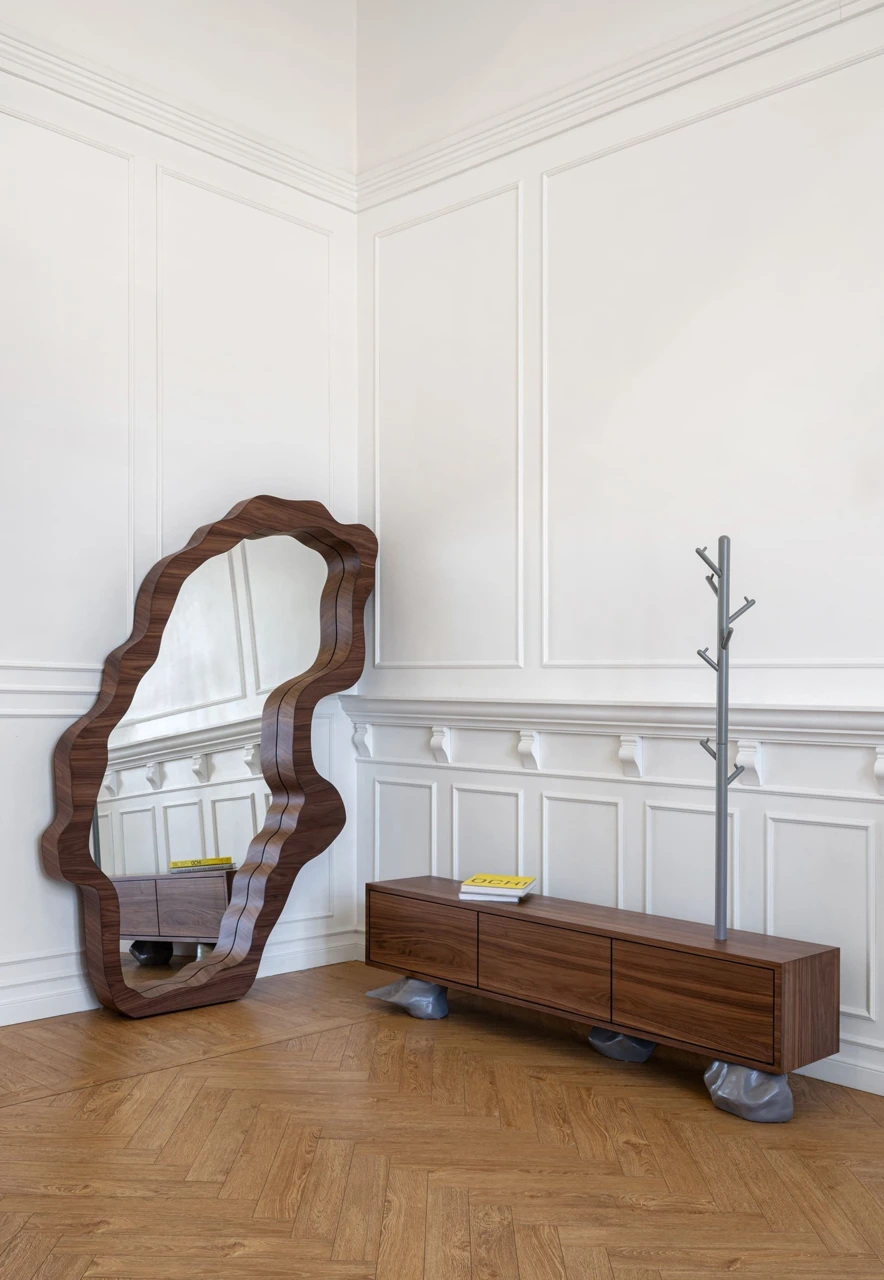 Предметы бренда ОДИНГЕНИЙ представляют собой цельные конструкции, покрытые натуральным шпоном различных пород дерева. Для создания устойчивого покрытия со сложной геометрией, команда в течение нескольких лет разрабатывала уникальную технологию и теперь использует ее для производства ярких самобытных предметов.