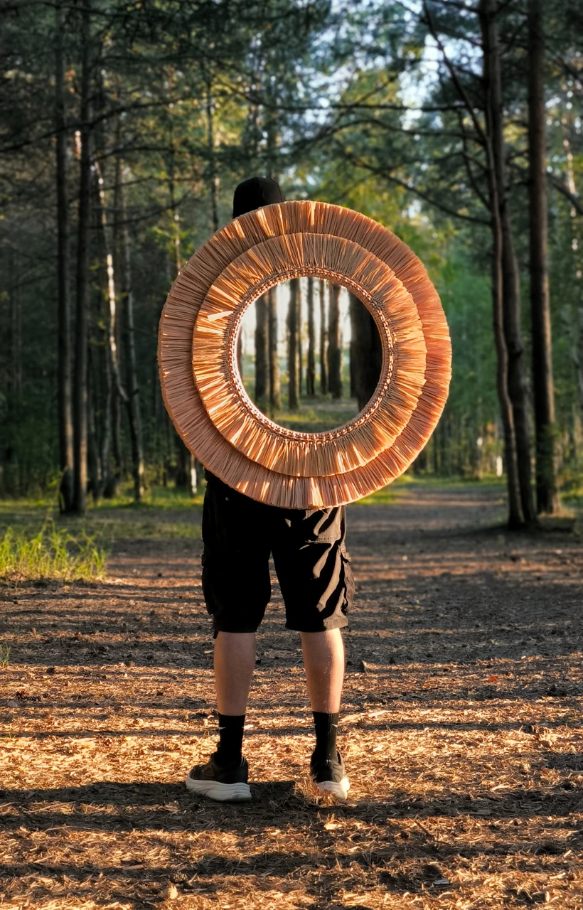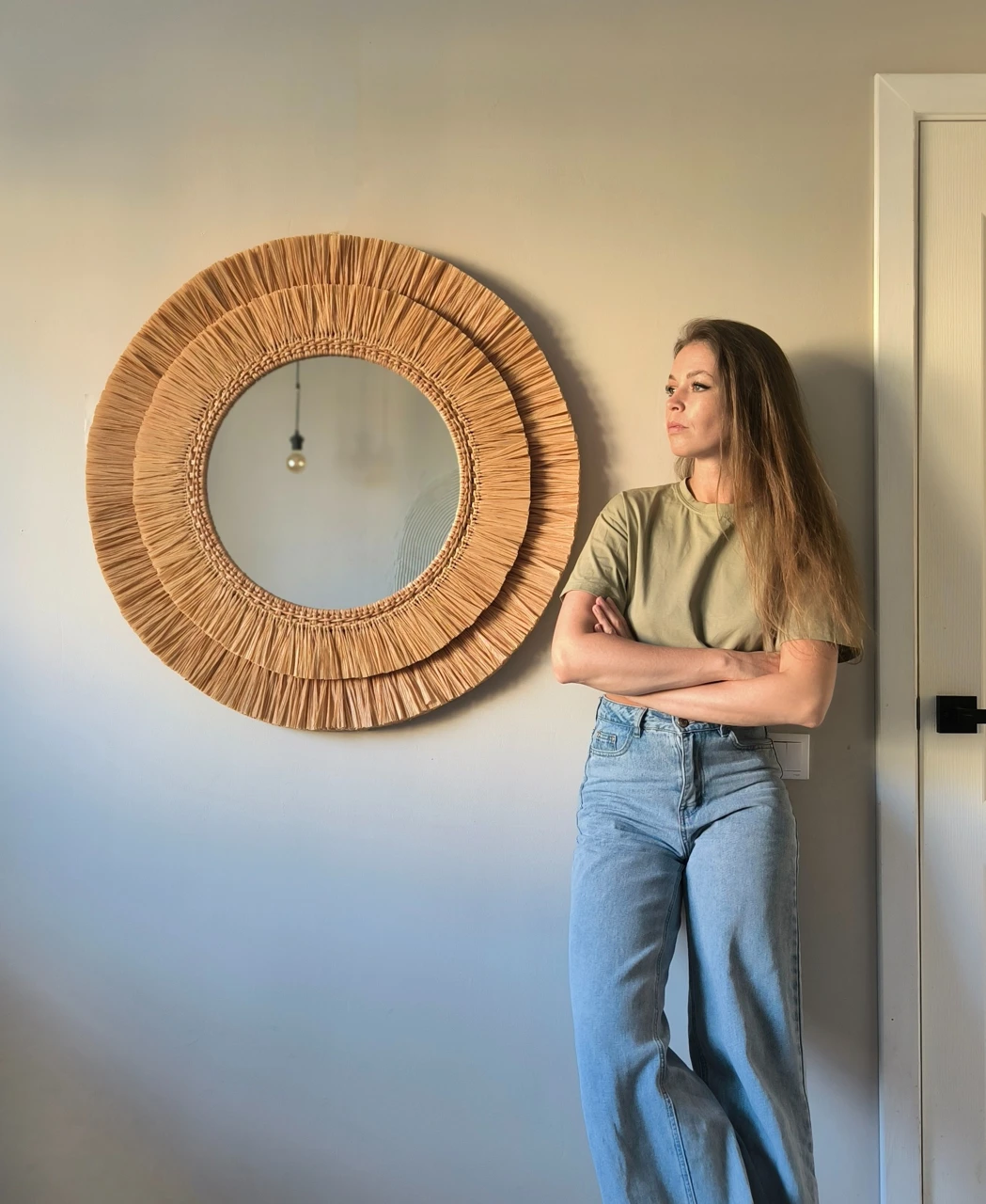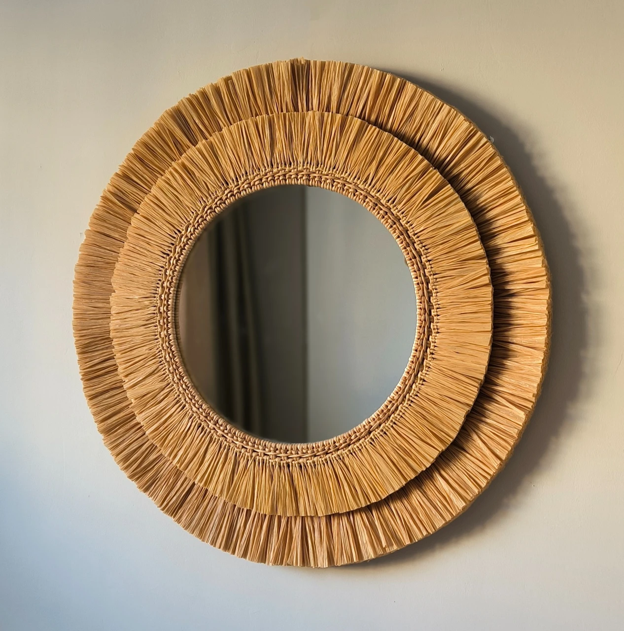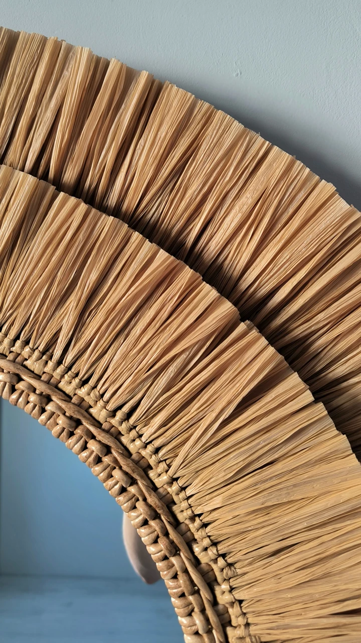 Эффектное интерьерное решение, которое работает и как зеркало, и как самостоятельный декор. Двойная окантовка из рафии создает мягкую игру света и тени, а крупный формат делает зеркало главным акцентом стены. Идеально для зоны прихожей или спальни.