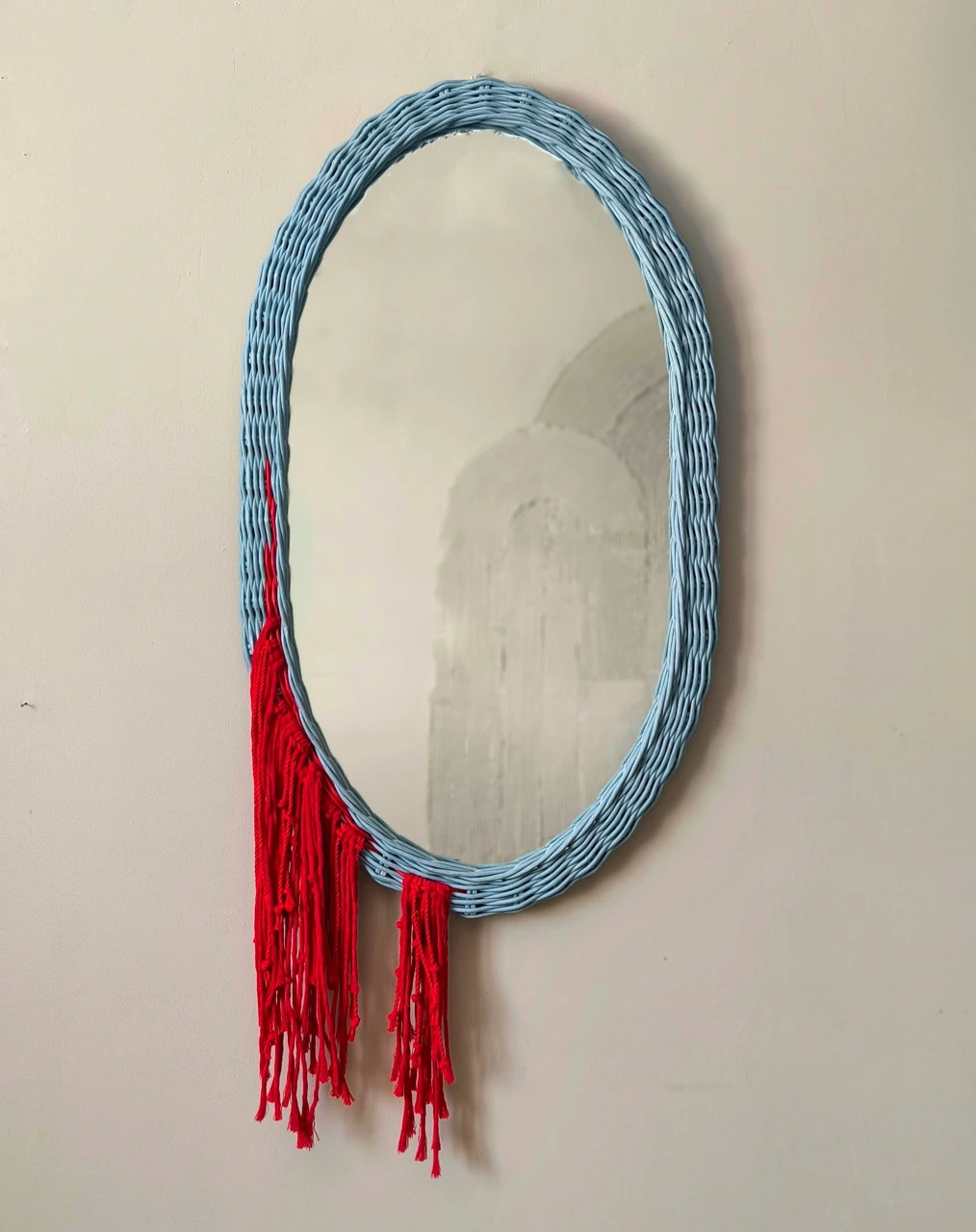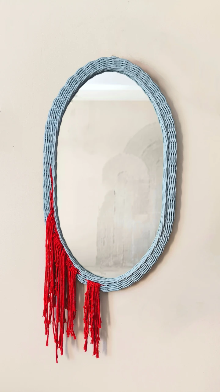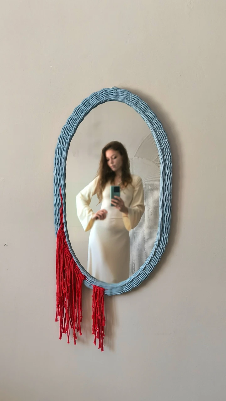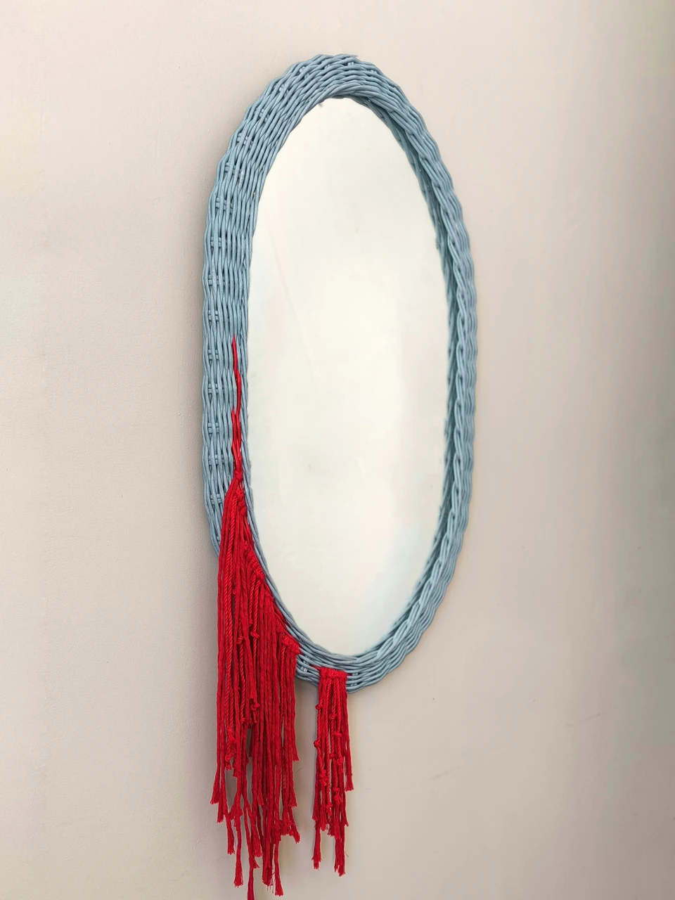 Голубое настенное зеркало с красными хлопковыми нитями подойдет для оформления стены в прихожей или ванной комнате. Плетеное овальное зеркало станет акцентным элементом в современном интерьере вашего дома.