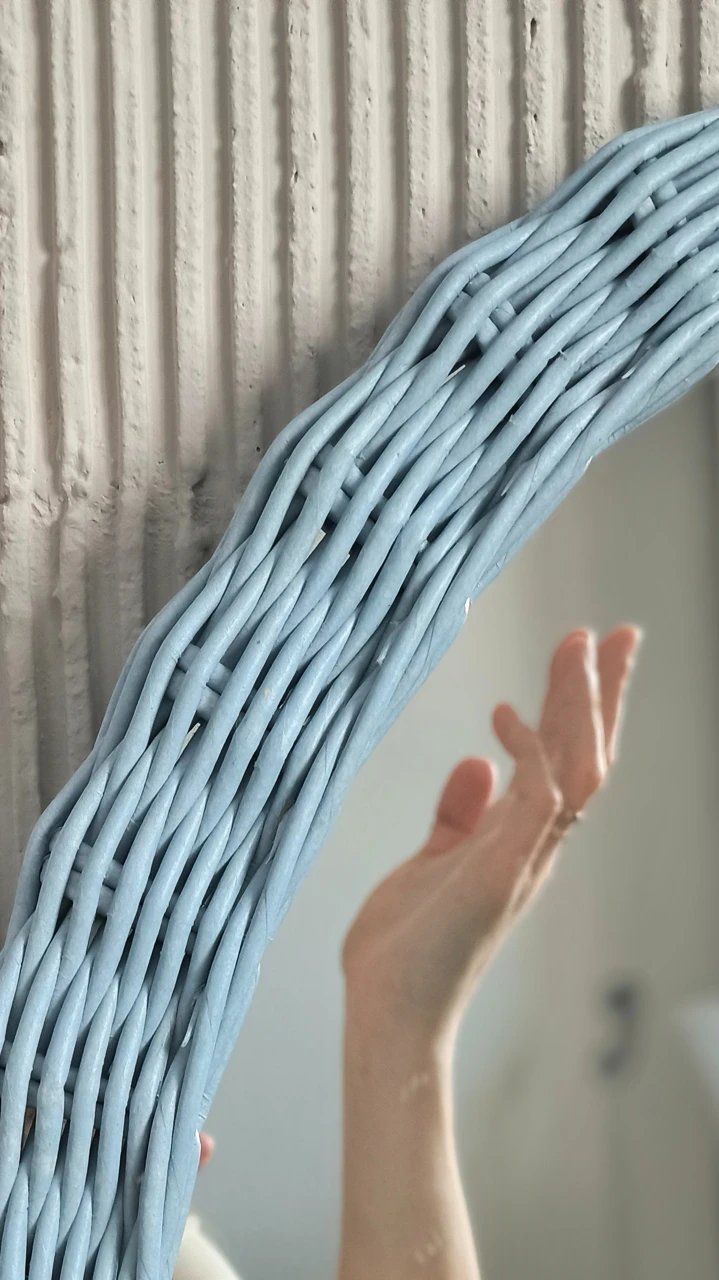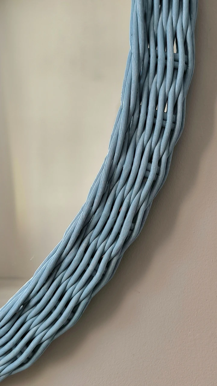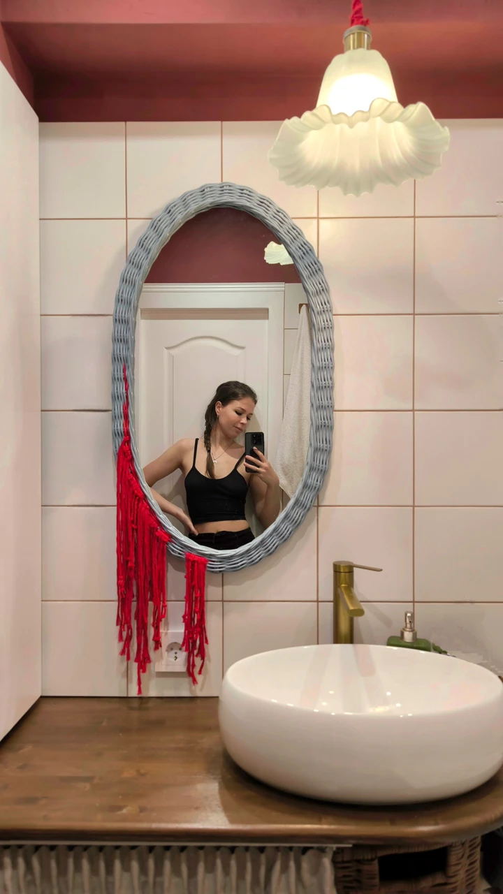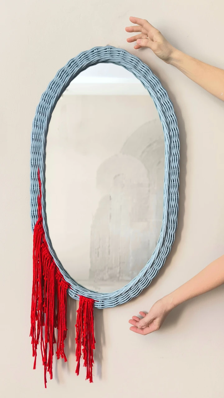 Голубое настенное зеркало с красными хлопковыми нитями подойдет для оформления стены в прихожей или ванной комнате. Плетеное овальное зеркало станет акцентным элементом в современном интерьере вашего дома.
