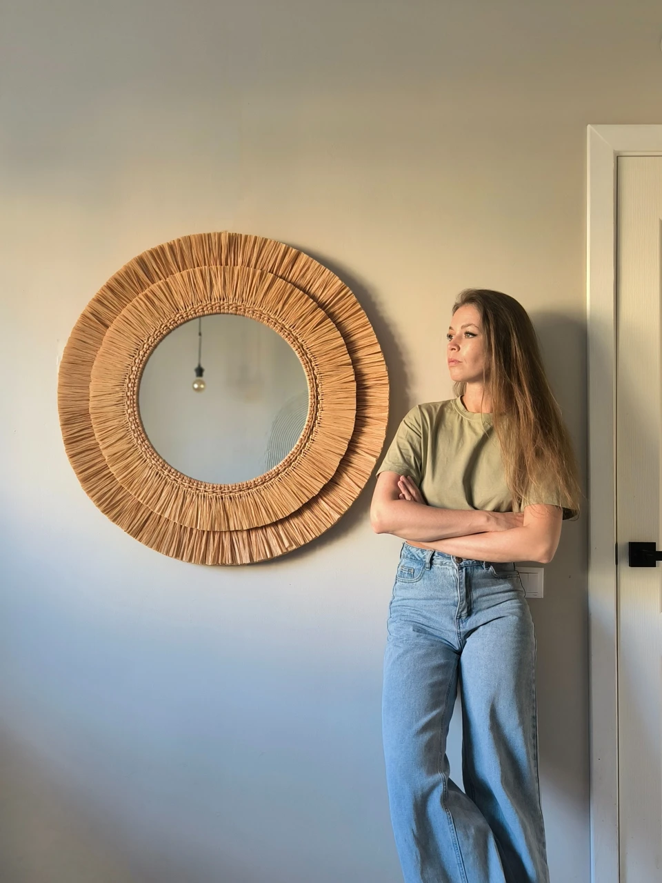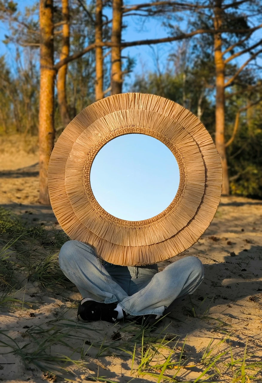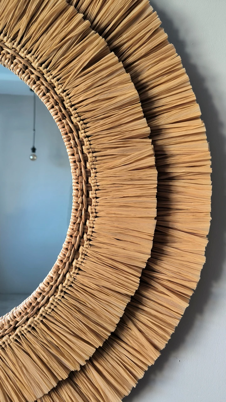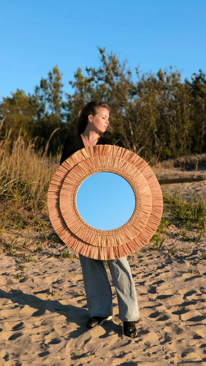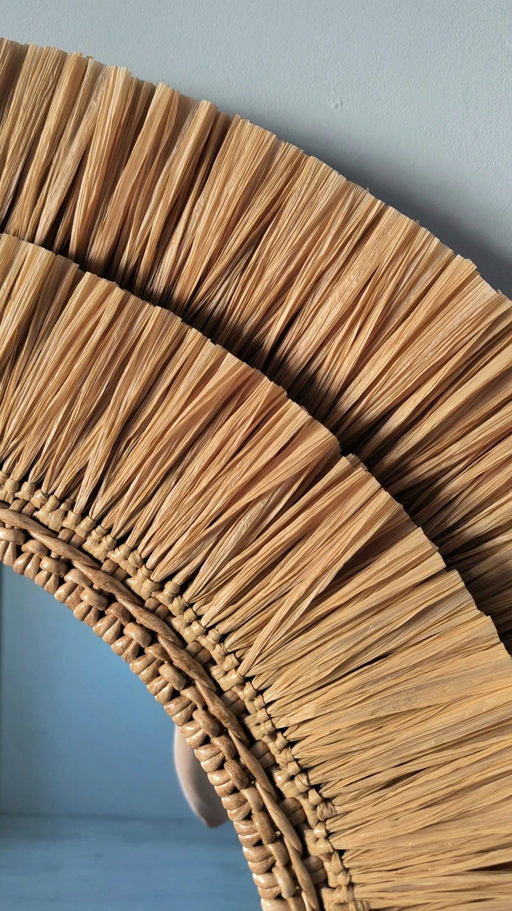 Большое настенное зеркало из рафии подойдет для оформления стены в прихожей или ванной комнате. Так же это круглое зеркало в плетеной раме подойдет для декорирования зоны над изголовьем кровати в спальне. Интерьерное декоративное зеркало хорошо смотрится и в других локациях и помещениях, например, в зоне лестницы в холле, над камином в гостиной, в гостиной над диваном. Так же подойдет для оформления стен в кафе и ресторане.