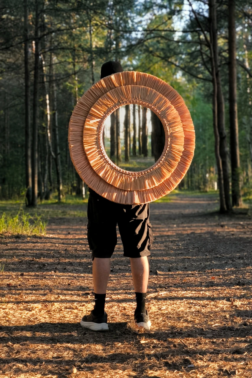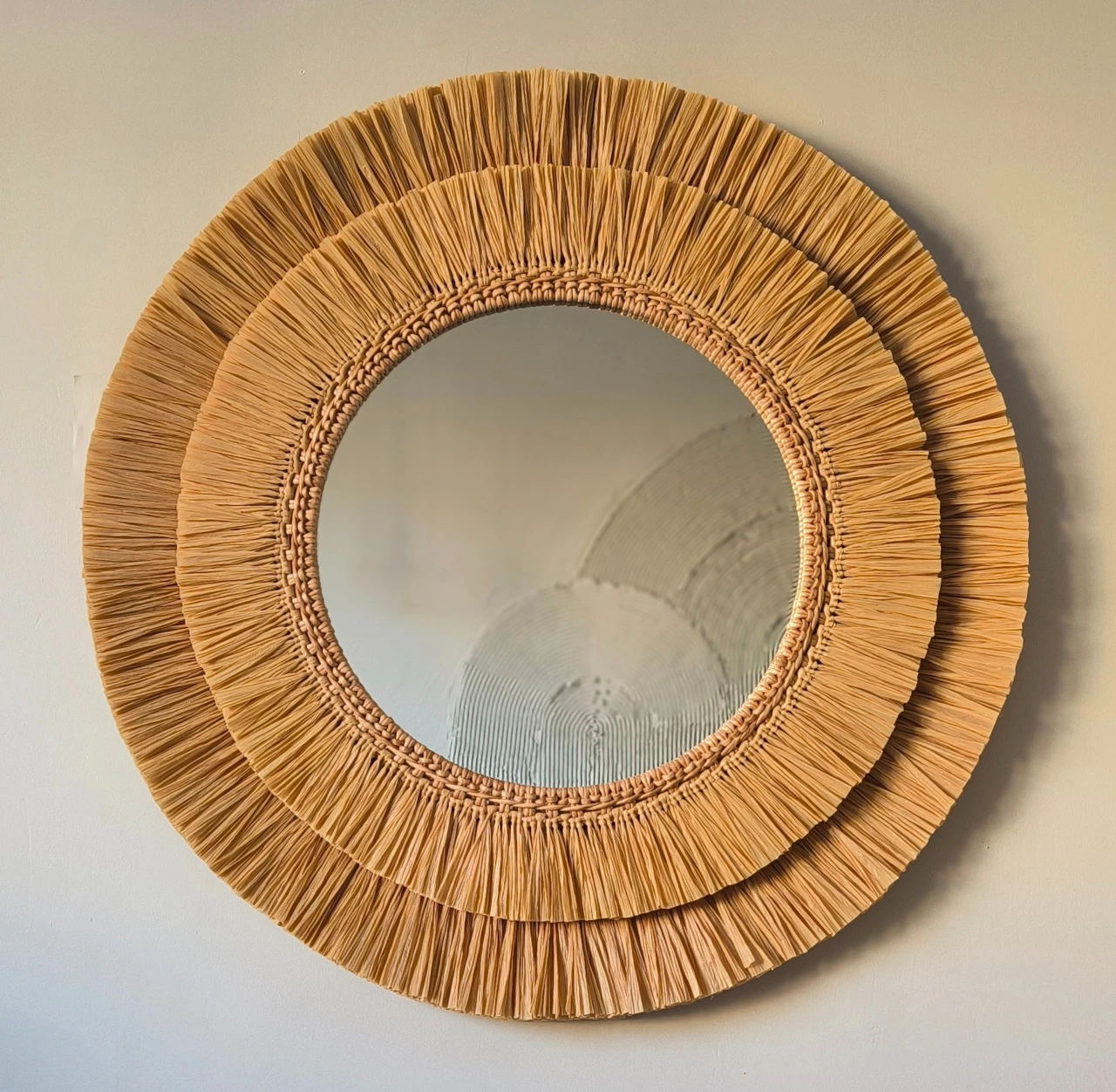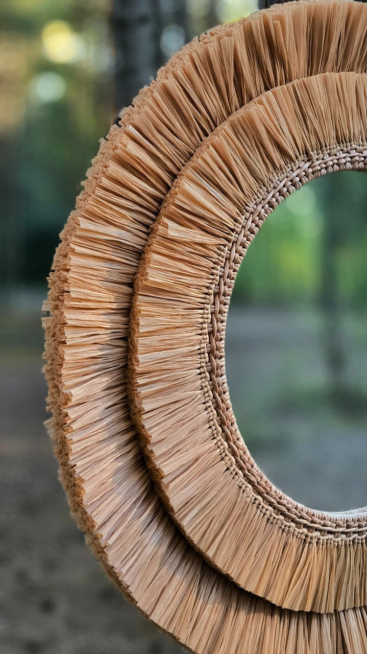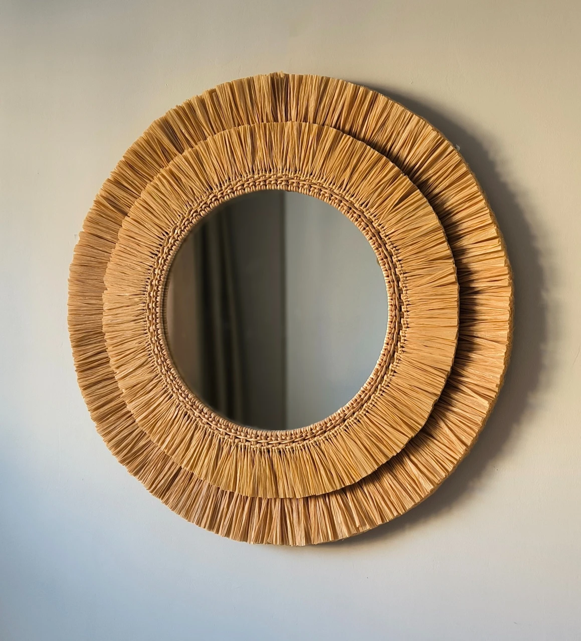 Большое настенное зеркало из рафии подойдет для оформления стены в прихожей или ванной комнате. Так же это круглое зеркало в плетеной раме подойдет для декорирования зоны над изголовьем кровати в спальне. Интерьерное декоративное зеркало хорошо смотрится и в других локациях и помещениях, например, в зоне лестницы в холле, над камином в гостиной, в гостиной над диваном. Так же подойдет для оформления стен в кафе и ресторане.