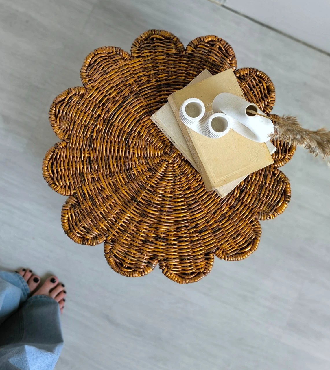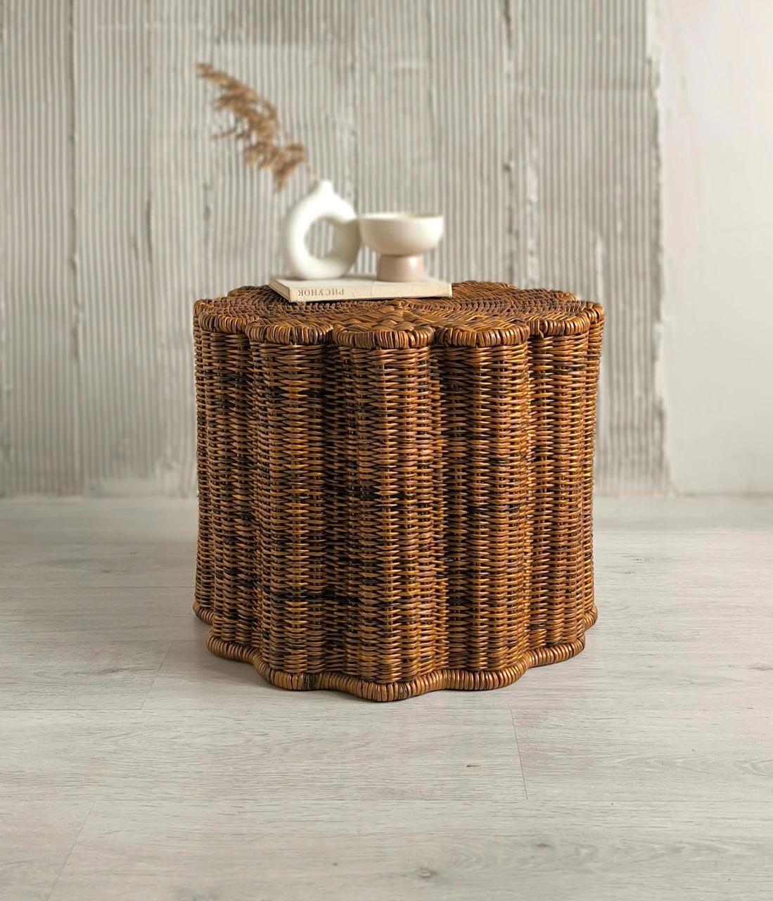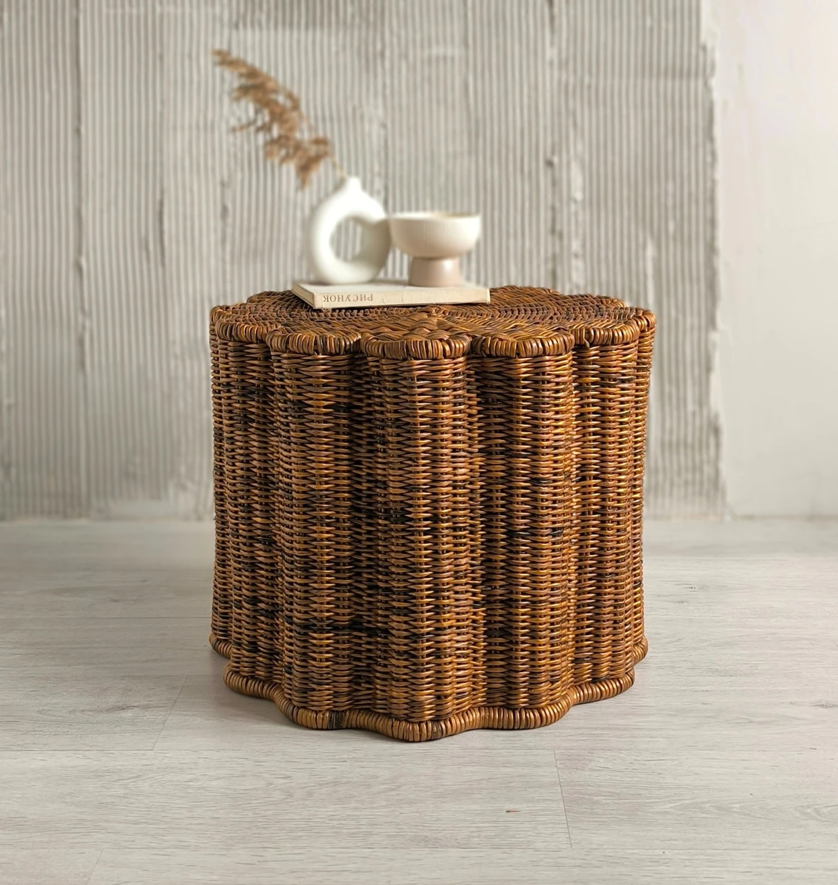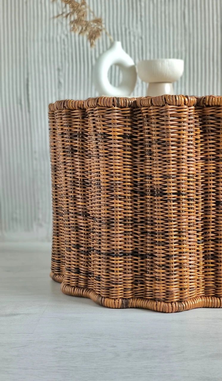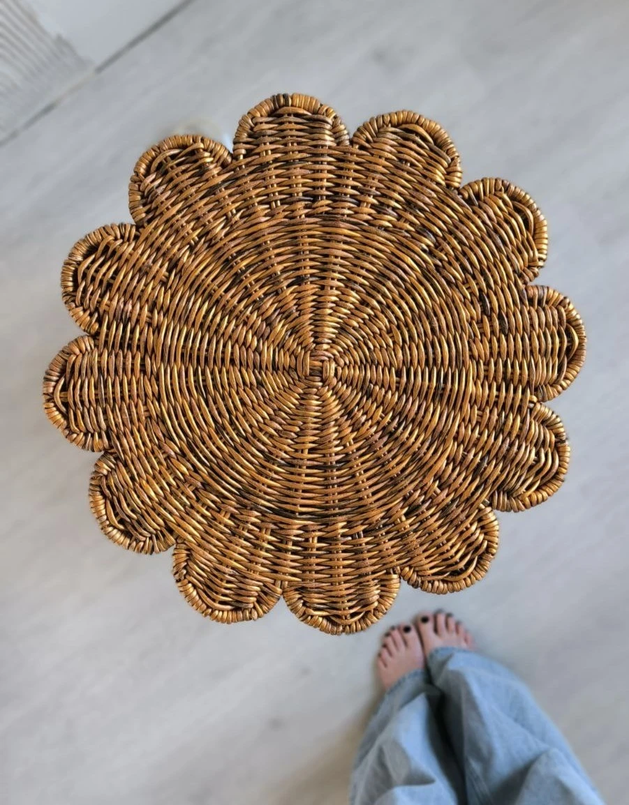 Современный плетеный столик в форме цветка отлично впишется в гостиную. Так же этот журнальный столик-корзину можно использовать в качестве прикроватной тумбы в спальне.