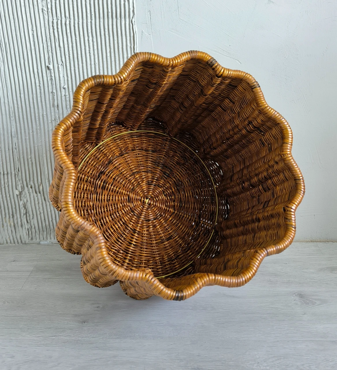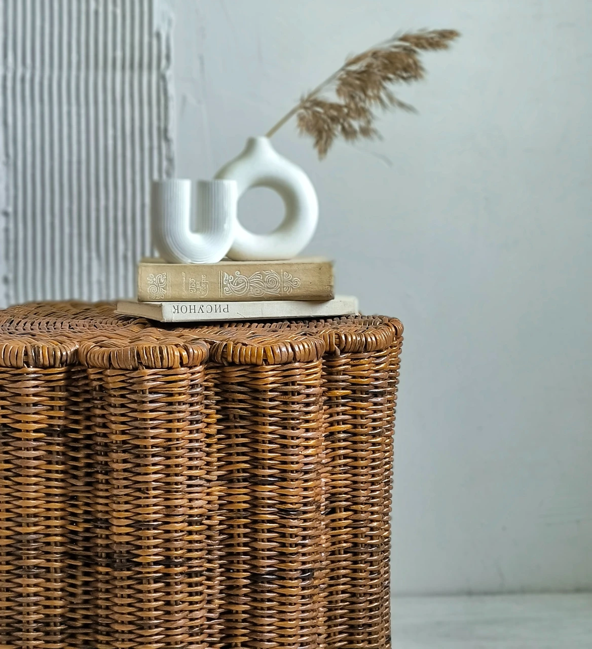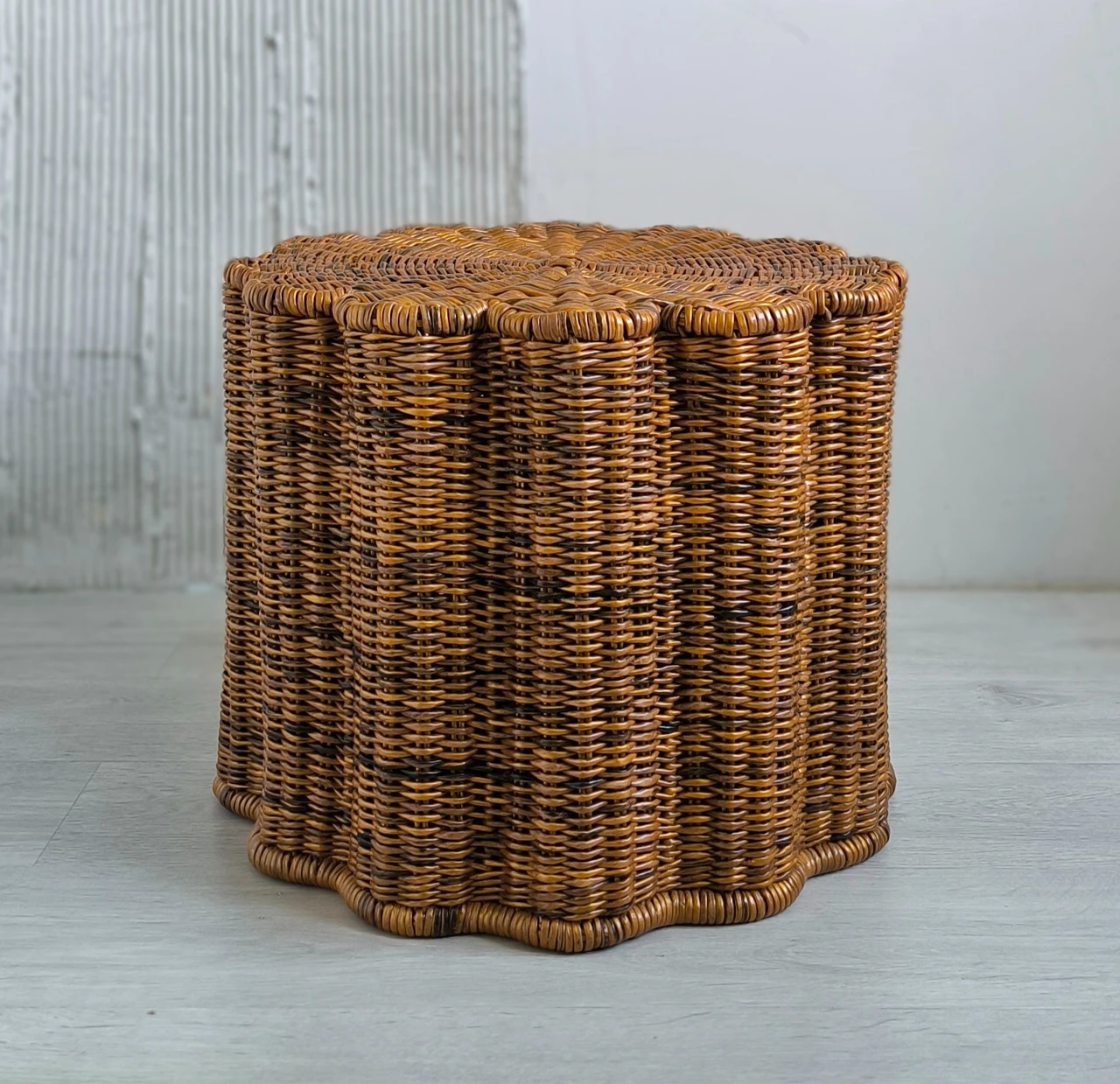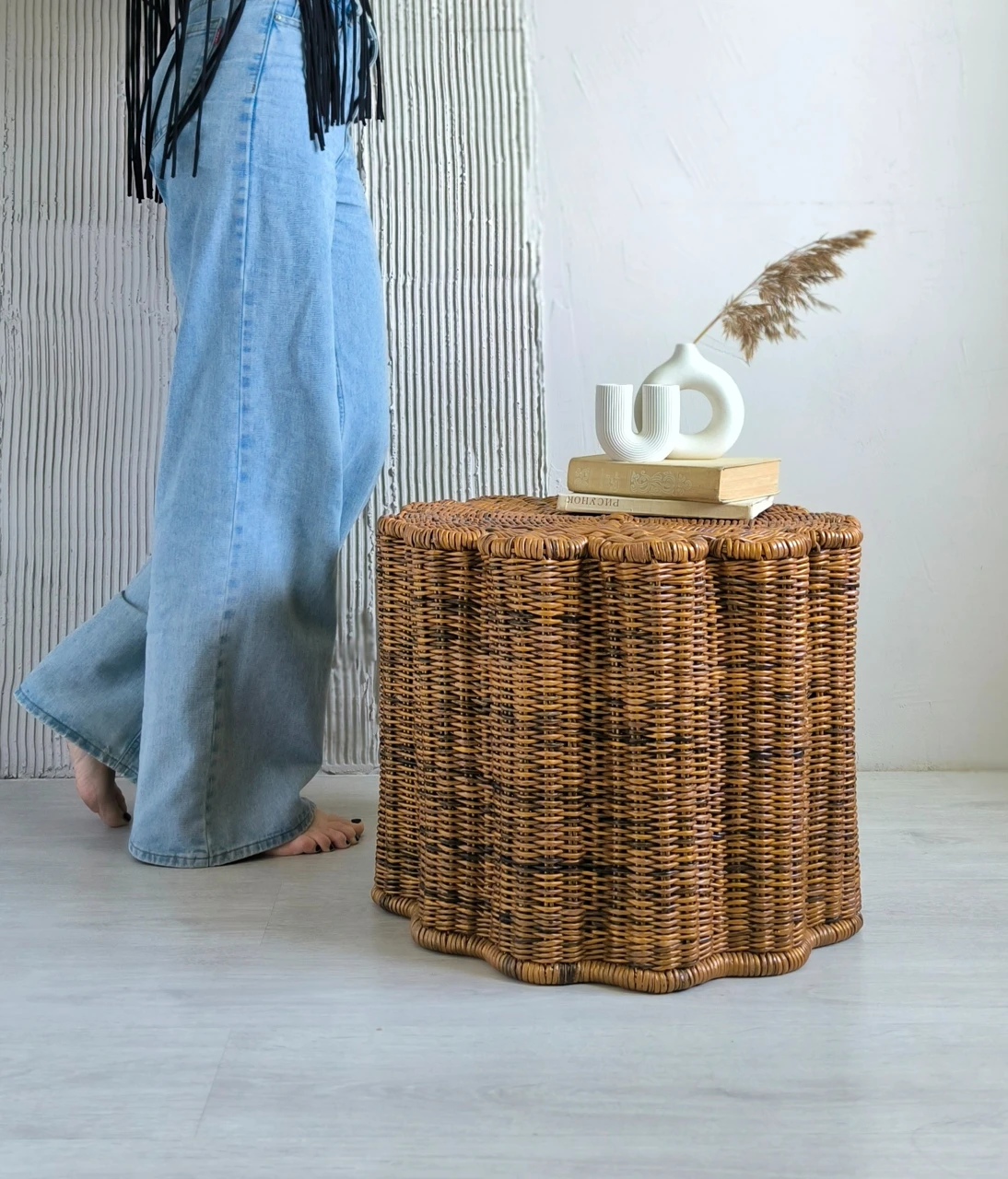 Современный плетеный столик в форме цветка отлично впишется в гостиную. Так же этот журнальный столик-корзину можно использовать в качестве прикроватной тумбы в спальне.